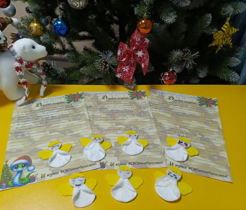 Так, маленькие подопечные Наримановского КЦСОН в эти дни написали трогательные письма на фронт. В них они выразили слова благодарности всем тем, кто сейчас исполняет свой воинский долг, поздравили с Новым годом и пожелали Победы и удачи. В качестве оберегов изготовили маленьких ангелов, возможно, они украсят какую-нибудь фронтовую елку. Среди детей были и те, чьи близкие сейчас находятся в зоне СВО.