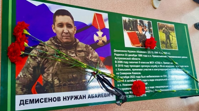 В прикаспийской школе торжественно открыли Парту Героя, посвященную памяти выпускника школы, погибшего при исполнении воинского долга в зоне СВО Демисенова Нуржана Абайевича.